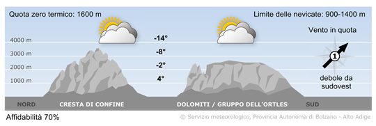 Sui gruppi montuosi centrali, tra la Val d'Ultimo, la Val Sarentino e le Alpi dello Stubai e Zillertal, nubi basse limiteranno spesso la visibilità con possibilità di qualche debolissima nevicata isolata. Sui monti della Val Venosta e sulle Dolomiti di Sesto il tempo sarà invece in prevalenza soleggiato.