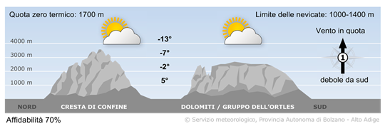 In montagna la visibilità sarà localmente ridotta dalle nubi. In giornata ci saranno tratti soleggiati soprattutto sui gruppi montuosi occidentali e sulle Dolomiti. In serata saranno possibili deboli nevicate.