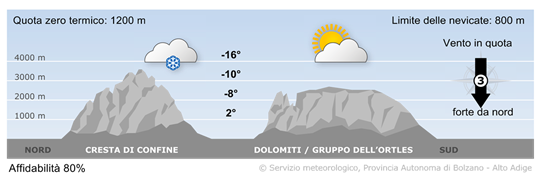 Sui monti della cresta di confine e localmente anche sulle Dolomiti ci saranno ancora dei rovesci nevosi. Altrove il tempo sarà soleggiato a tratti. Venti da nord in attenuazione anche se ancora di forte intensità.