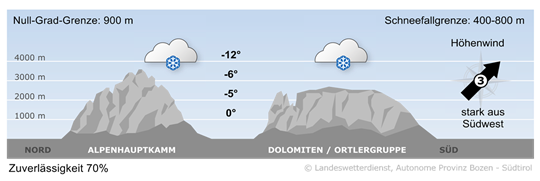 Wolken behindern auf den Bergen häufig die Sicht. Tagsüber ist es meist noch trocken, am Abend und in der Nacht setzt verbreitet leichter Schneefall ein.