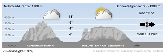 Wolken und Nebel schränken auf Südtirols Bergen oft die Sicht ein, stellenweise zeigt sich aber auch die Sonne. Am freundlichsten ist es in den westlichen Gebirgsgruppen und in den östlichen Dolomiten.